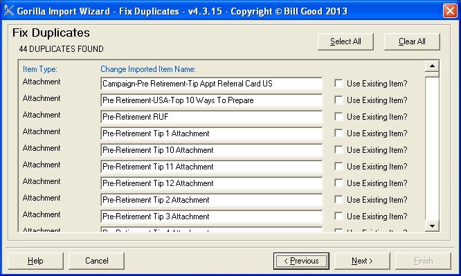 The “Fix Duplicates” screen is used to prevent re-importing documents that you already have in your system. You can choose to either re-import or use existing. Typically, we recommend to click the “Select All” button and not re-import an item. Click “Next.”