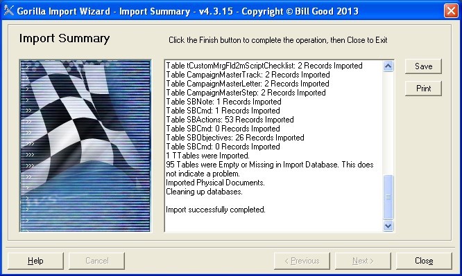 Click “Finish” and wait for the campaign to import. If you would like to, you can choose to print or save the Gorilla database report after the campaign has been imported. The report will show you all the files that were imported into your database. Click “Close” to finish the import.