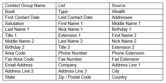 Please note that if a field you wish to import is not on this list, you cannot export it with the Import/Export utility. Contact your marketing support representative for more details about specialized export options.